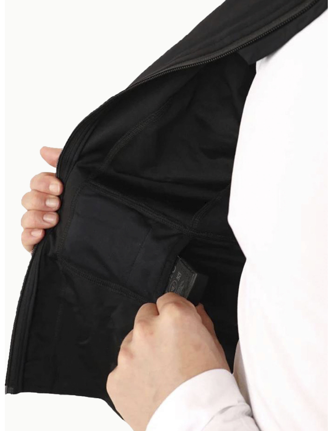 - Fastgør batterierne til vesten med trykknapperne i begge sider hvor der også er lommer til batterierne